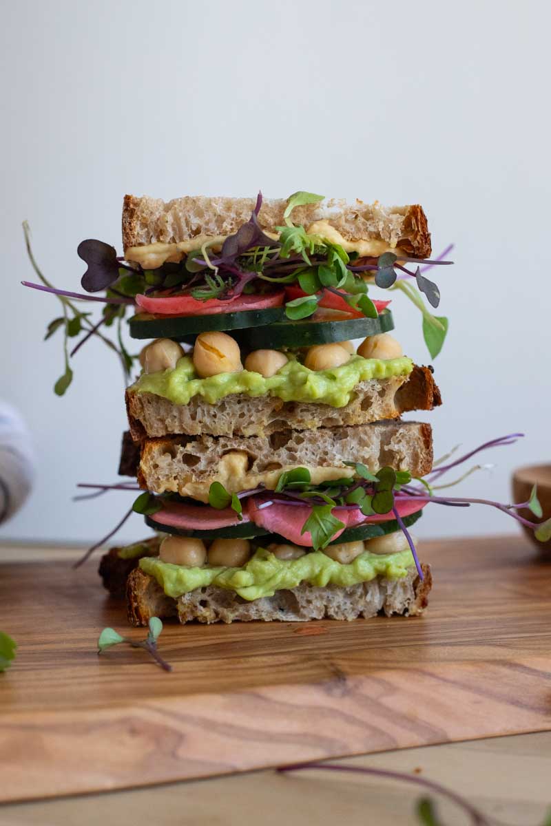 This is the best quick and easy, no cooking required sandwich that you can throw together on a busy day. Mashed avocado gets mixed with a squeeze of lemon and flaky salt before being piled onto lightly toasted whole grain sourdough. It gets loaded with chickpeas, crunchy cucumbers, tangy pickled veggies, and fresh microgreen before getting topped off with a slice of hummus slathered sourdough.