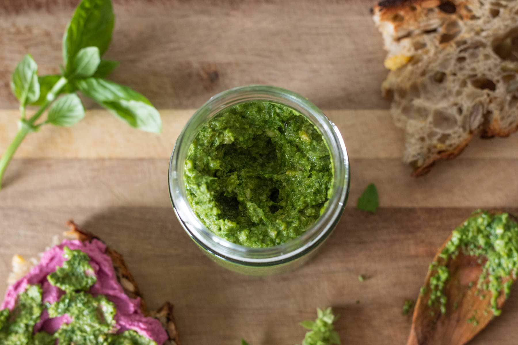 Add basil, cashews, olive oil, nutritional yeast, garlic, lemon juice, and salt to a food processor or small blender cup and process until mixture becomes a thick, slightly chunky paste. If it’s too thick to blend thoroughly, add a tiny splash of water until you get the desired consistency. Store in an airtight jar in the fridge until ready to use.